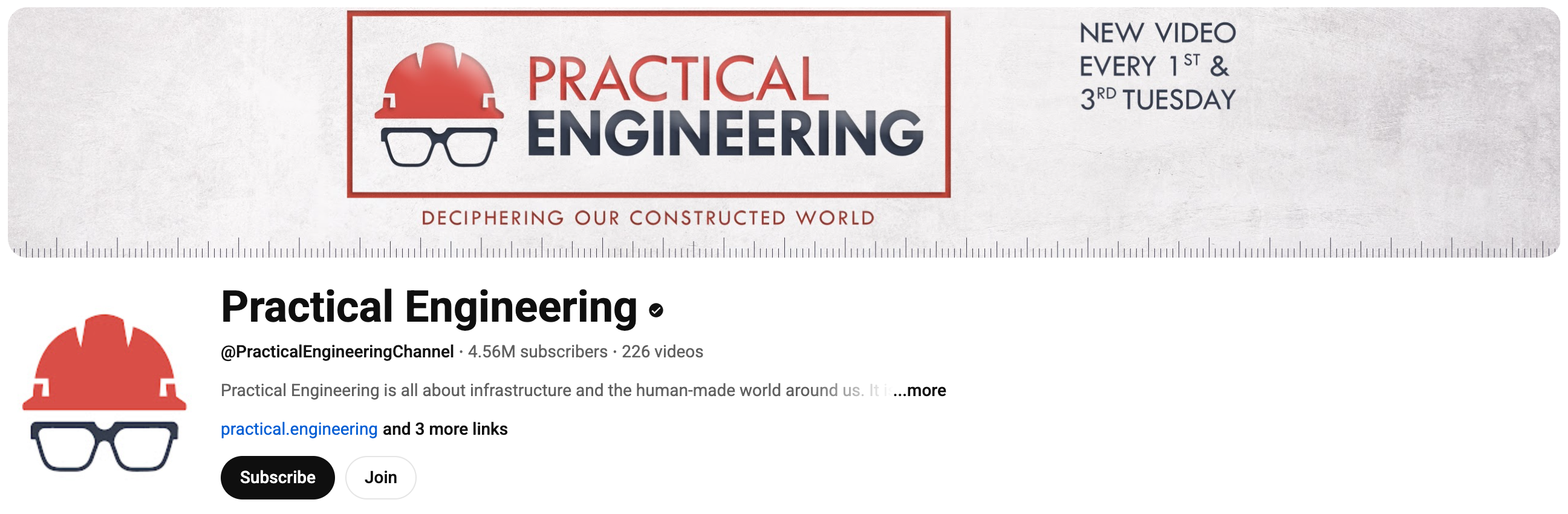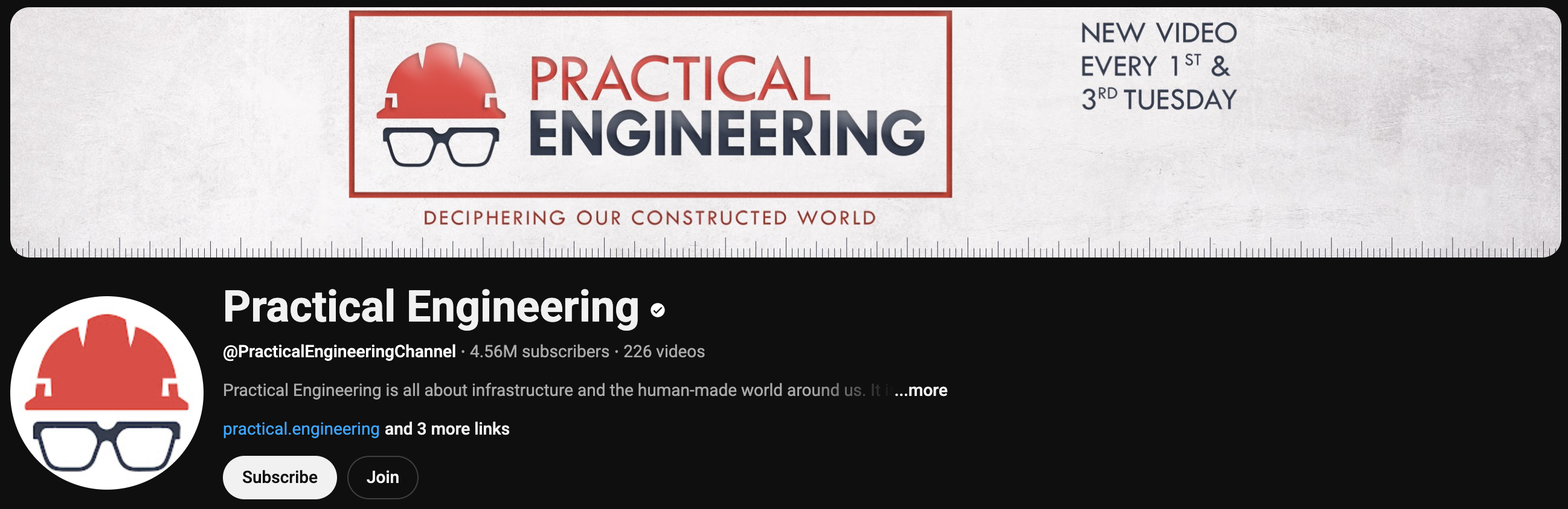 Practical Engineering (by Grady Hillhouse) examines infrastructure, engineering design, and public works. The channel uncovers how dams, roads, hydrology, and structures operate — often using models and visual demonstrations to explain what's happening behind the scenes.